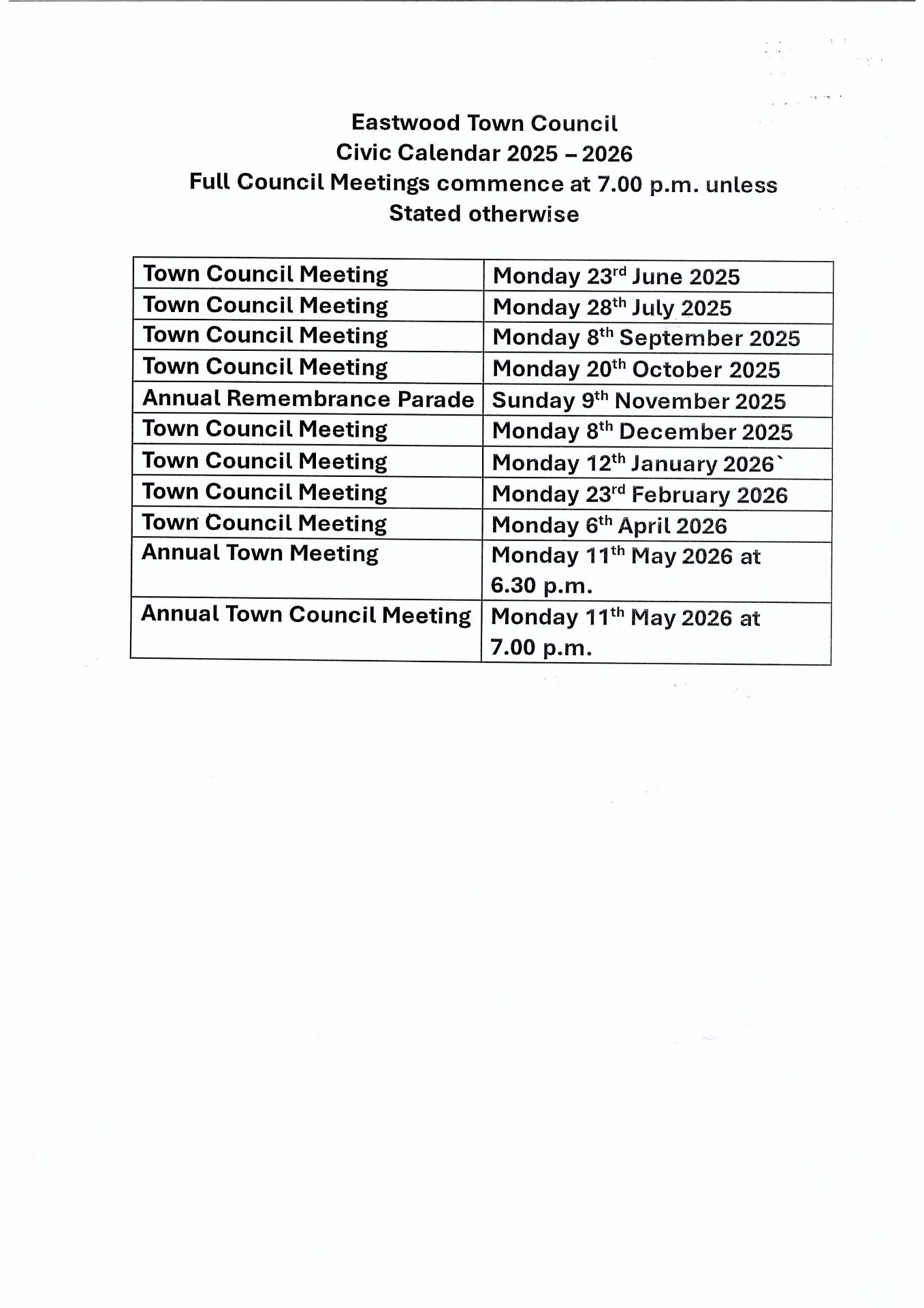 Eastwood Town Council Calendar of Meetings 2025 – 2026